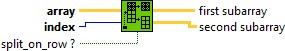 Divides array at index and returns the two portions with the element of index at the beginning of second subarray. |