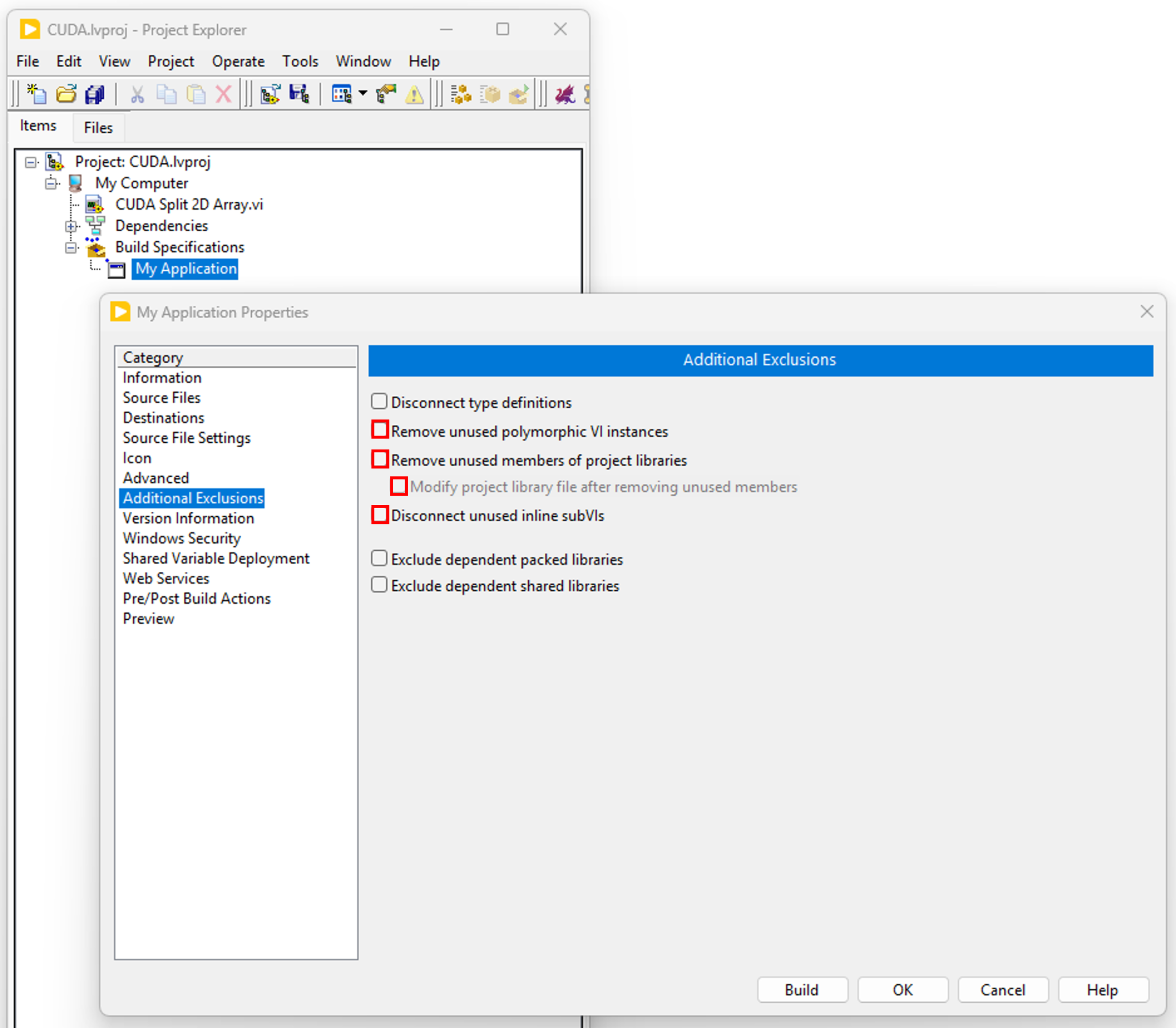 - Create your executable and in the βAdditional Exclusionsβ tab, uncheck βRemove unused polymorphic VI instancesβ, βRemove unused members of project librariesβ and βDisconnect unused inline subVIsβ.