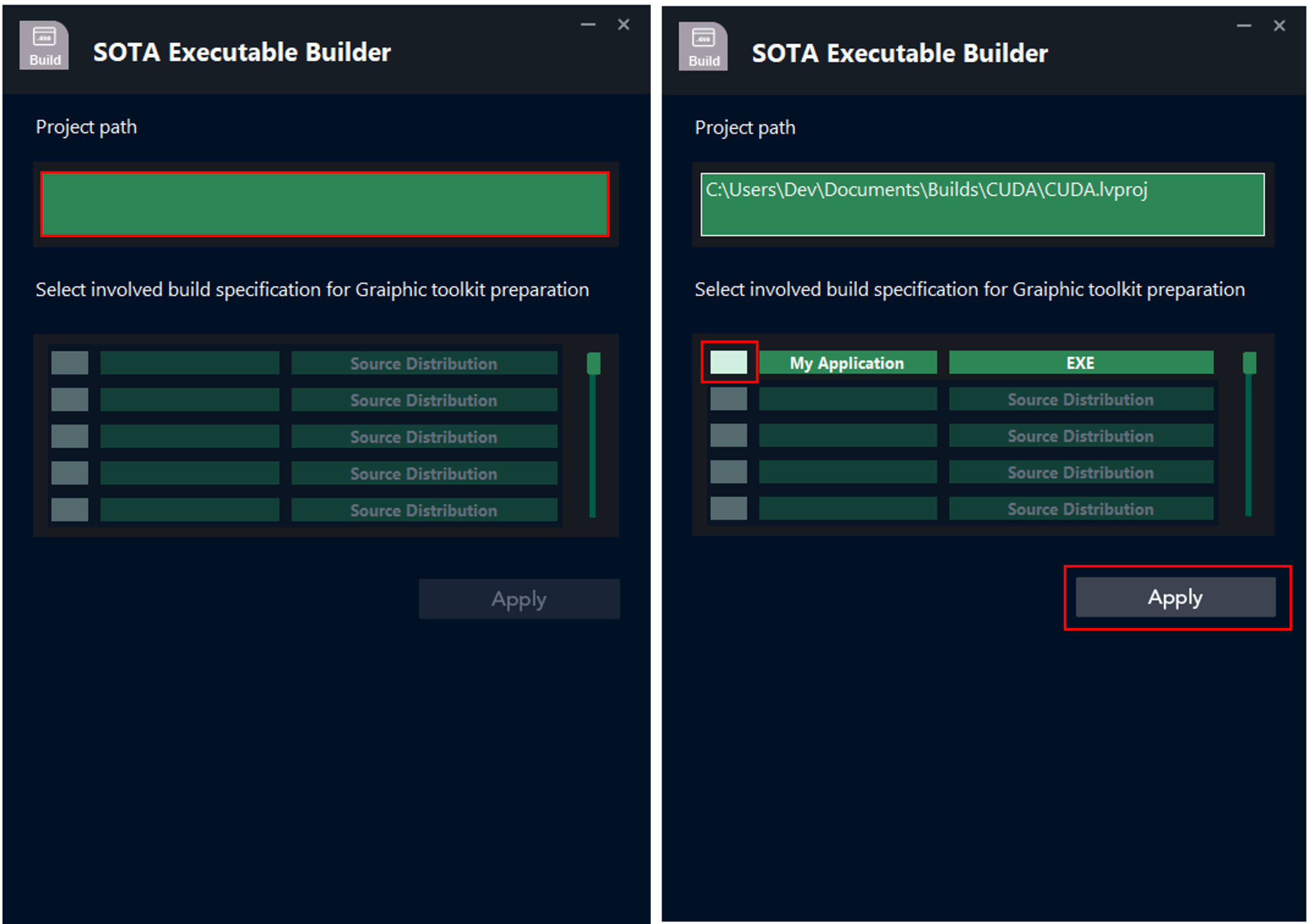 - Run the VI and click on theΒ Project PathΒ field to select your project path. Once the path is selected, the list of executables you have created will be displayed. All you need to do is select the executable you want to build, and then clickΒ Apply.