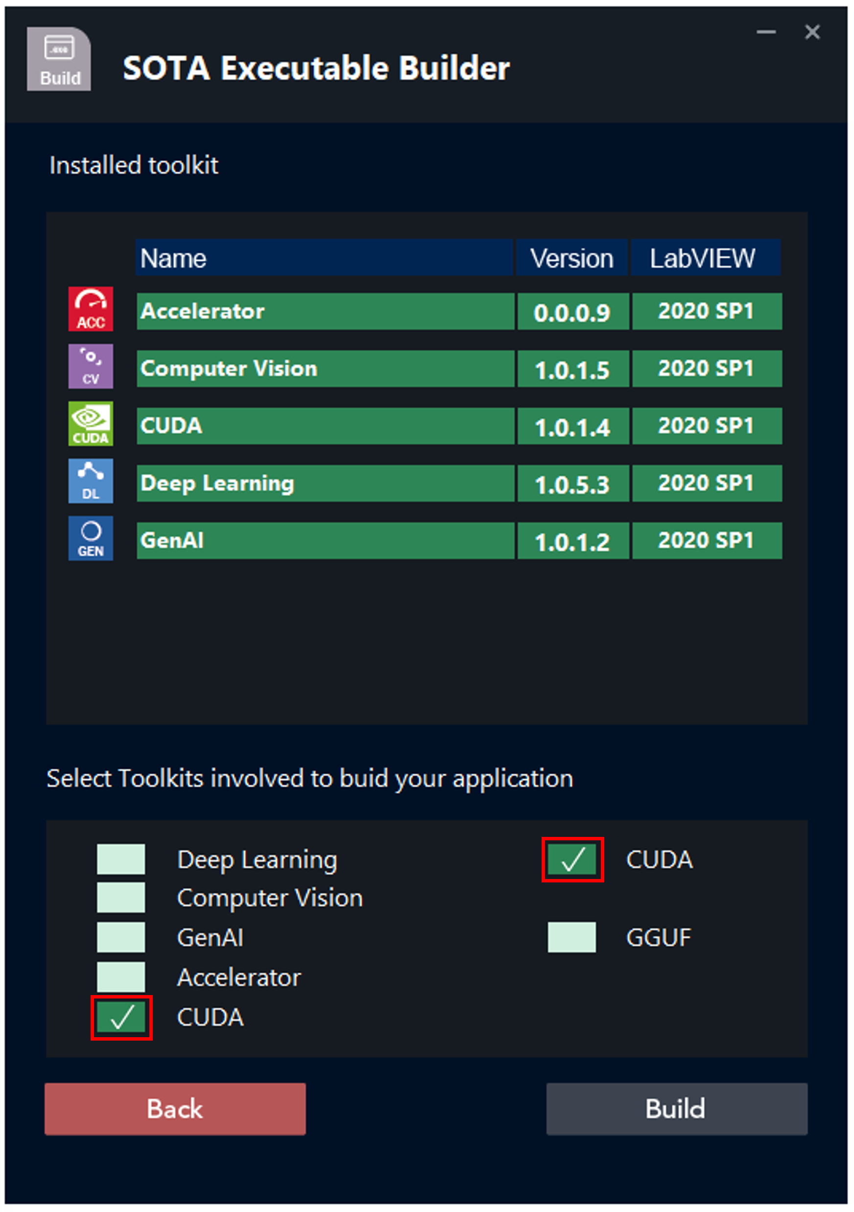 - On the second page, the toolkits installed on your computer are displayed. Simply select the toolkit(s) used in your project, and then clickΒ Build.