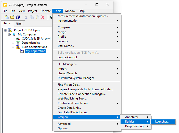 - Once your project has been created and configured, go to the LabVIEW menu, click onΒ Tools, then onΒ GraiphicΒ andΒ Builder, and launch theΒ Launcher. A VI will open: it will allow you to manage the build of your executable by including the files required for its operation, depending on the Graiphic toolkits you are using.