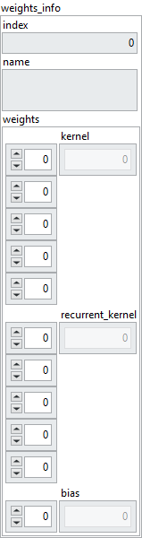 Gets the weights of the ConvLSTM3D layer selected by the index. Type : polymorphic.
